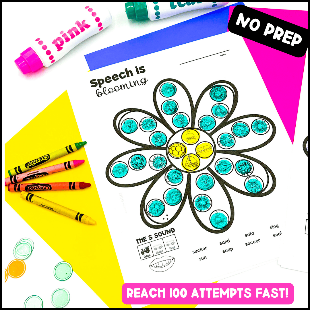 Dot Art is one of my favorite ways to get a TON of trials in for articulation practice. We use magnetic bingo chips first, then dot markers to get double the practice. Once we’re done….I send it home and they have an easy peasy practice sheet for home. Kids are thrilled to share their artwork and their parents like to see what we’re doing so they can practice at home.